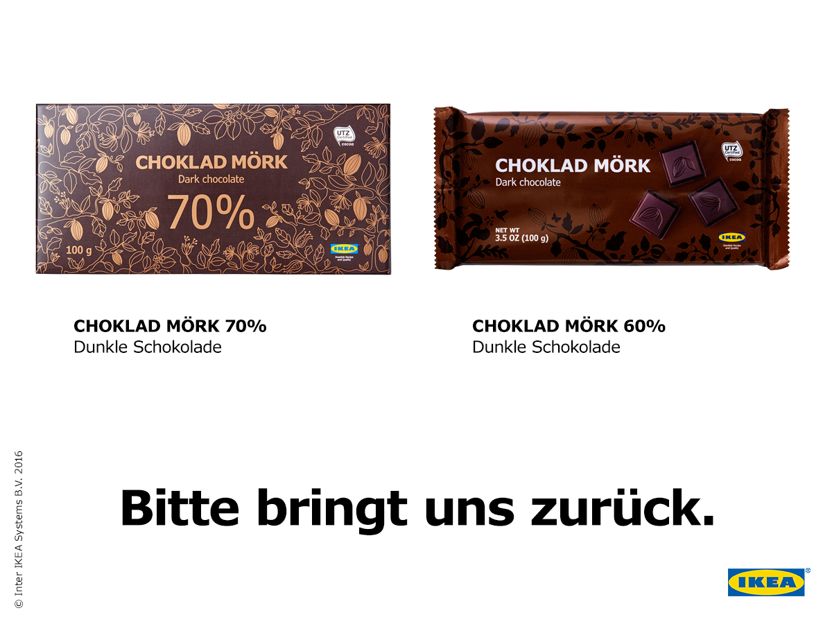 Die Schokolade kann in jedem IKEA Einrichtungshaus zurückgeben werden. Die Kunden bekommen den vollen Kaufpreis zurückerstattet. Ein Kaufbeleg (Kassenbon) ist nicht notwendig.
